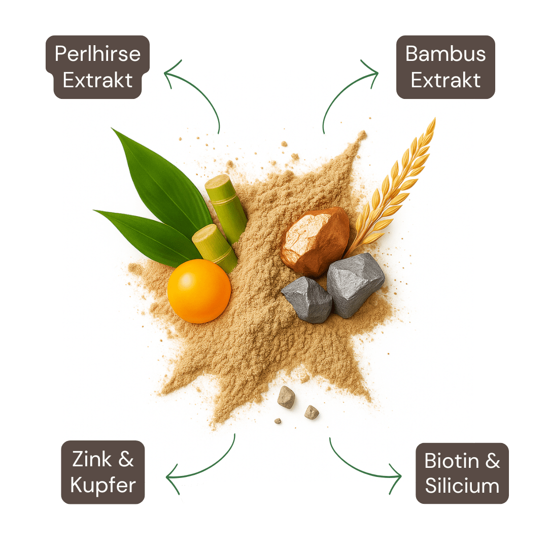 ✔️ Perl millet extract provides valuable minerals and amino acids and is traditionally known for its supportive effect on hair structure and nail growth.