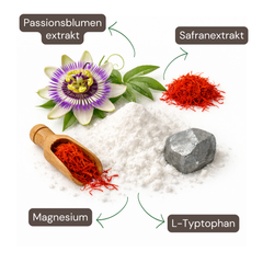 durchdachte Kombination aus L-Tryptophan, Passionsblumenextrakt, Safranextrakt, Magnesium und Vitamin B6 für innere Ausgeglichenheit und emotionale Balance – besonders in stressigen oder anspruchsvollen Lebensphasen.